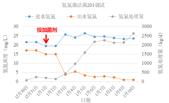 庫巴魯®氨氮激活菌201投加3日后出水氨氮開始降低,系統(tǒng)硝化能力明顯好轉(zhuǎn)